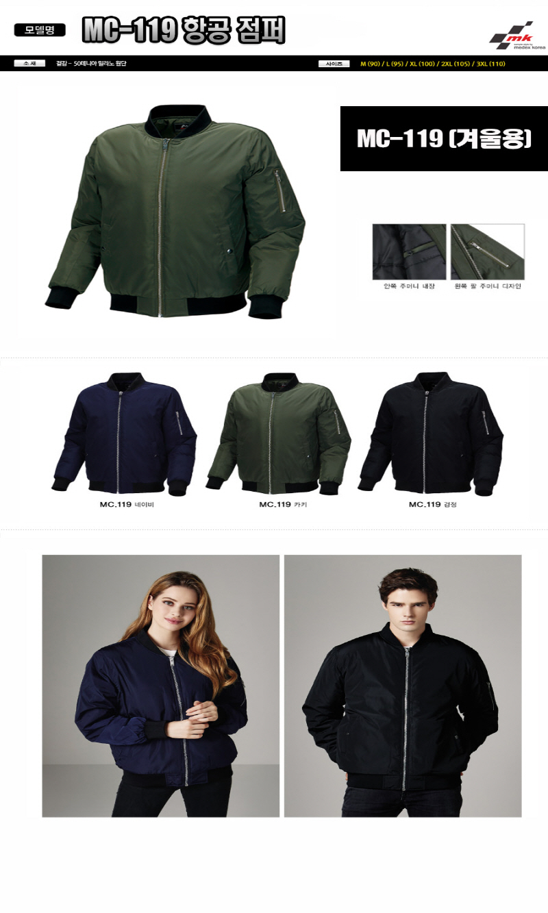 MC-119 •Size : M, L, XL, 2XL, 3XL •소재 : 겉감-50데니아 밀라노 원단 •특징 : 몸판에 고급스러운 에어로솜 5온스를 사용하여 정전기 방지에 용이 앞지퍼와 소매지퍼에 쇠지퍼를 사용하여 심플하게 장식 ※단가변동 있을 수 있습니다. 제품 색상은 인쇄된 것이므로 실제 제품과 다소 차이가 있을 수 있습니다.