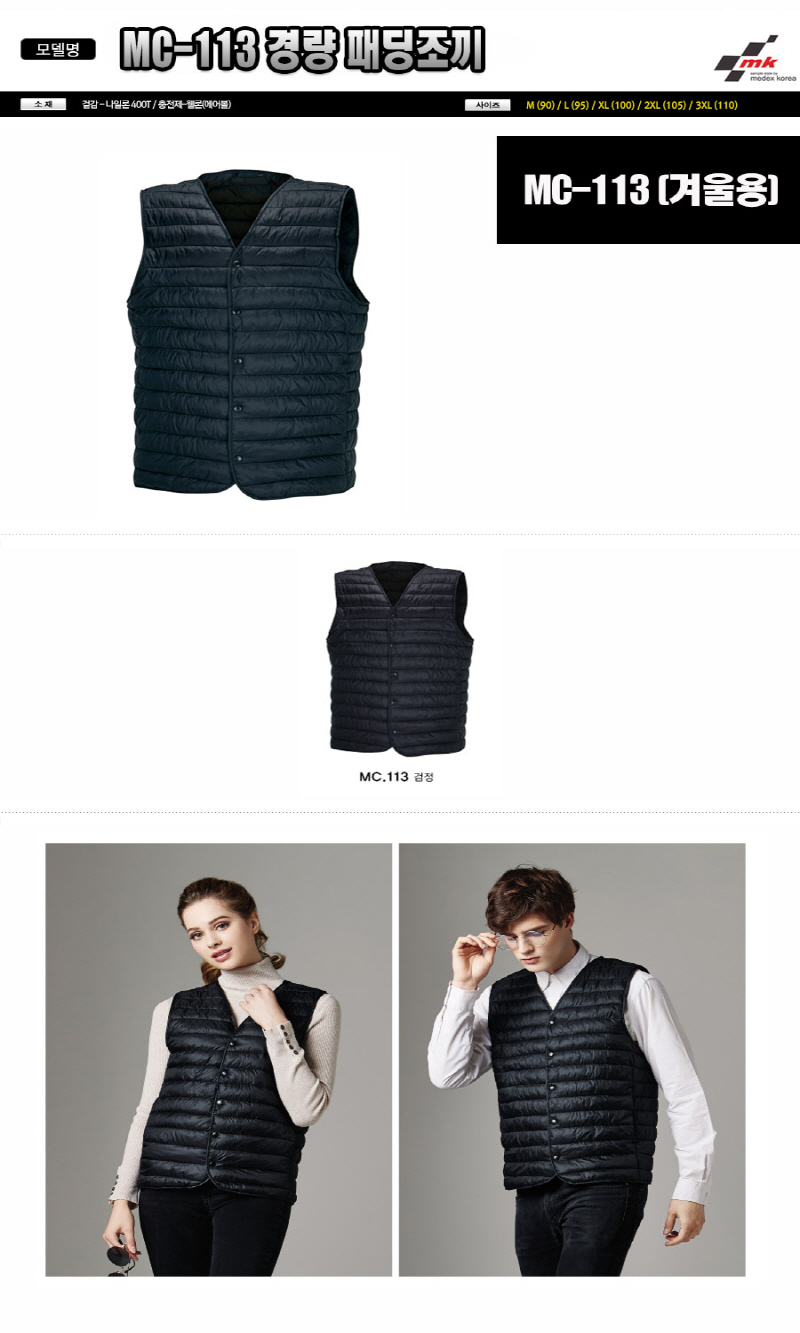 •Size : M, L, XL, 2XL, 3XL, 4XL •소재 : 겉감-나일론 400T 충전제-웰론(에어볼) ※단가변동 있을 수 있습니다. 제품 색상은 인쇄된 것이므로 실제 제품과 다소 차이가 있을 수 있습니다. MC-113