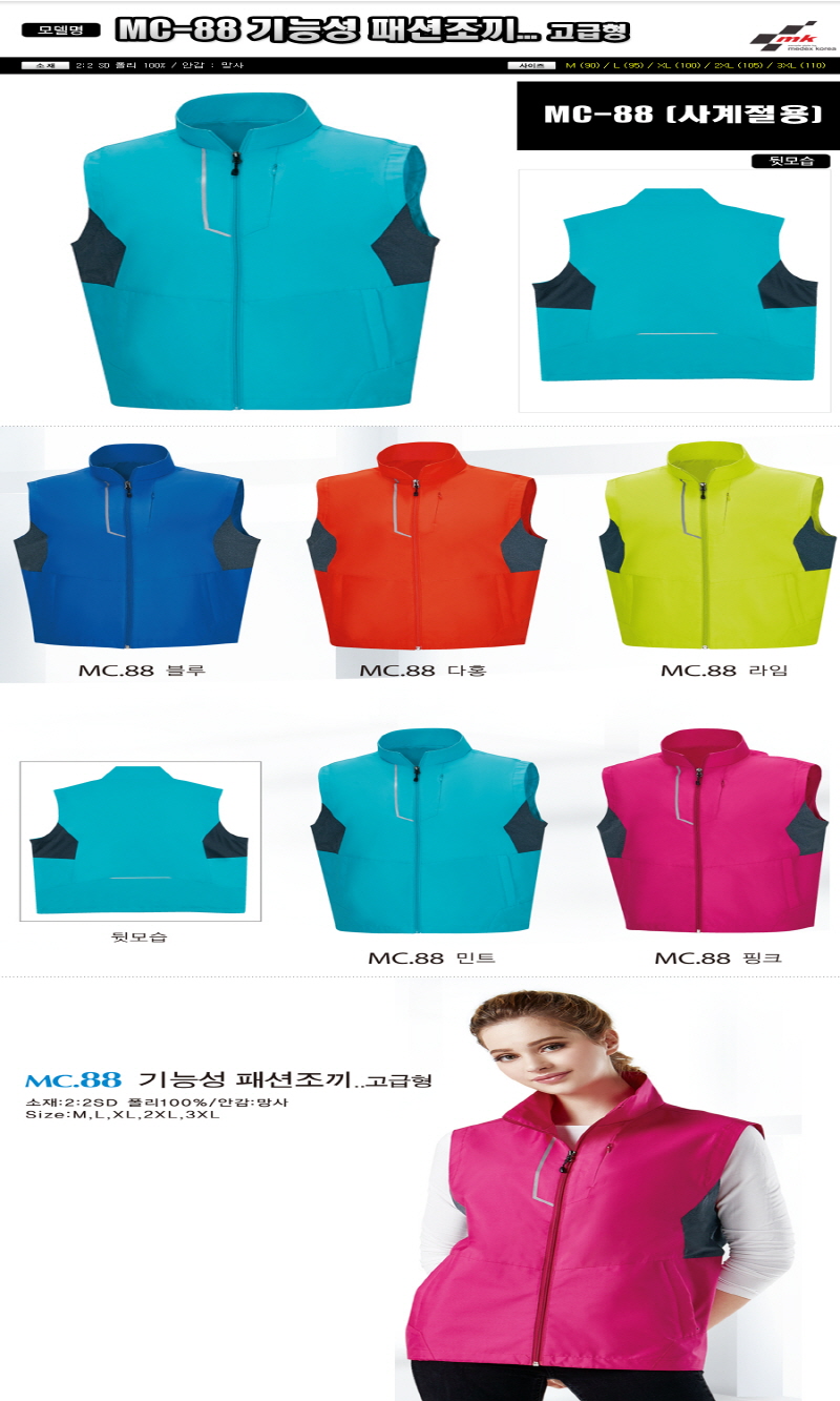 •Size : M, L, XL, 2XL, 3XL •소재 : 2:2 SD 폴리 100% / 안감 : 망사 ※단가변동 있을 수 있습니다. 제품 색상은 인쇄된 것이므로 실제 제품과 다소 차이가 있을 수 있습니다. MC-88