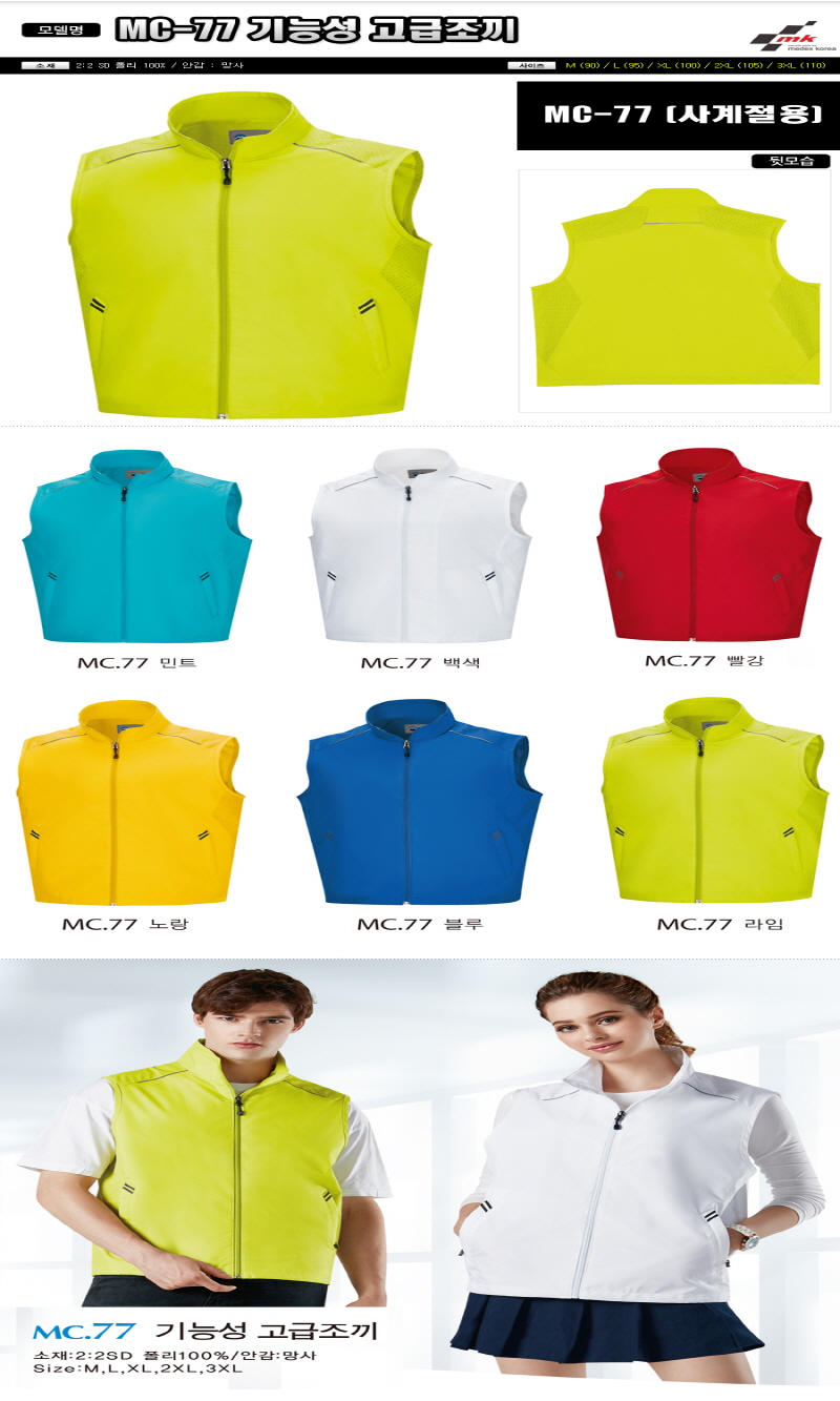 •Size : M, L, XL, 2XL, 3XL •소재 : 2:2 SD 폴리 100% / 안감 : 망사 ※단가변동 있을 수 있습니다. 제품 색상은 인쇄된 것이므로 실제 제품과 다소 차이가 있을 수 있습니다. MC-77