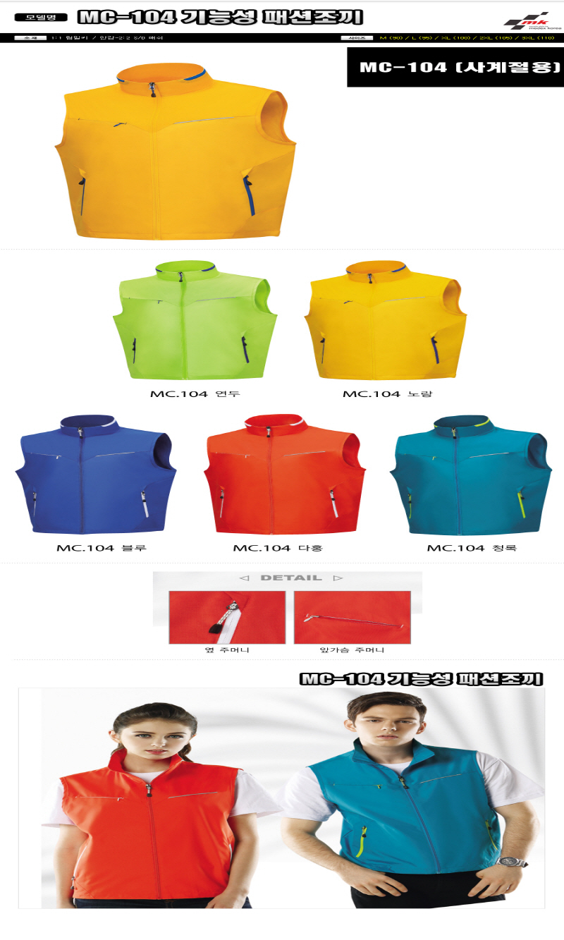 MC-104 •Size : M, L, XL, 2XL, 3XL •소재 : 겉감-1:1 립밀키/안감-2:2 S/D 매쉬 ※단가변동 있을 수 있습니다. 제품 색상은 인쇄된 것이므로 실제 제품과 다소 차이가 있을 수 있습니다.