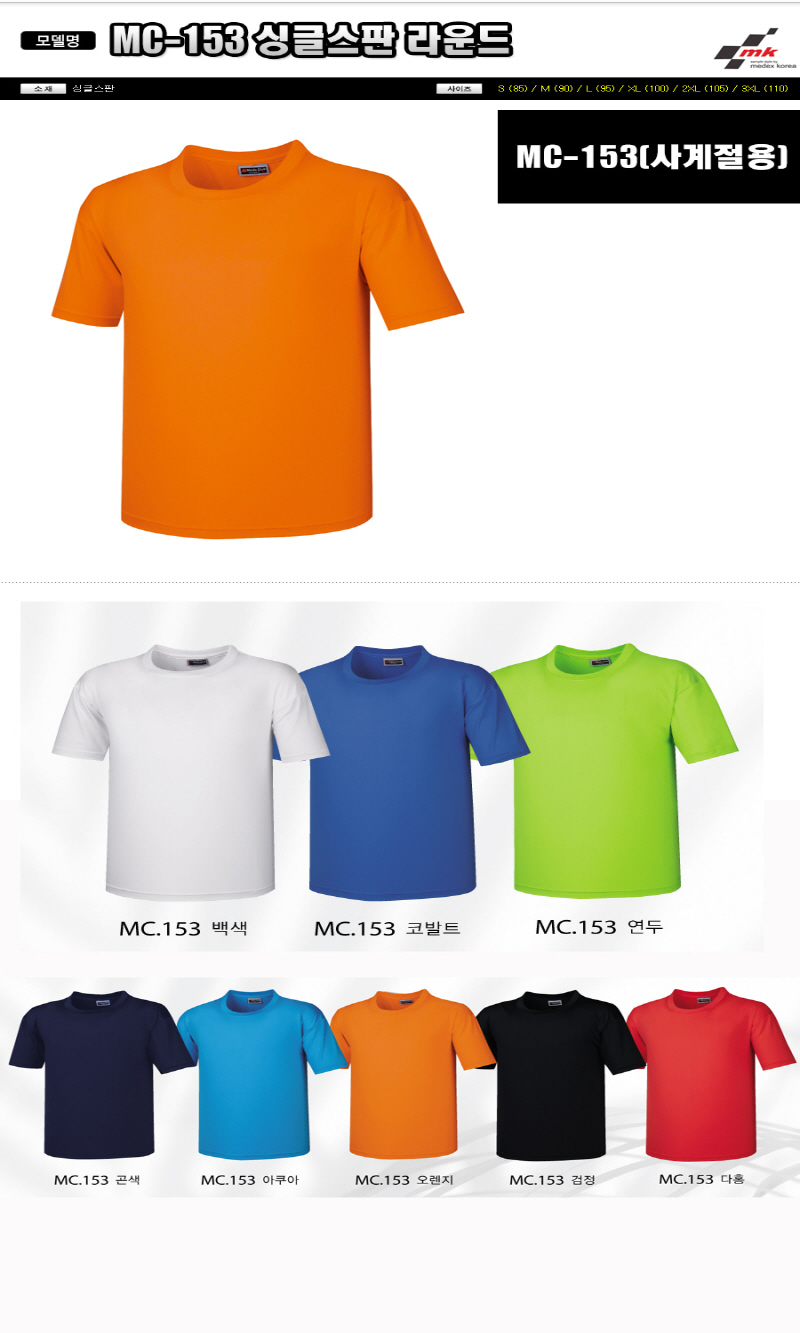 MC-153 •Size : S, M, L, XL, 2XL, 3XL •소재 : 싱글스판 ※단가변동 있을 수 있습니다. 제품 색상은 인쇄된 것이므로 실제 제품과 다소 차이가 있을 수 있습니다.