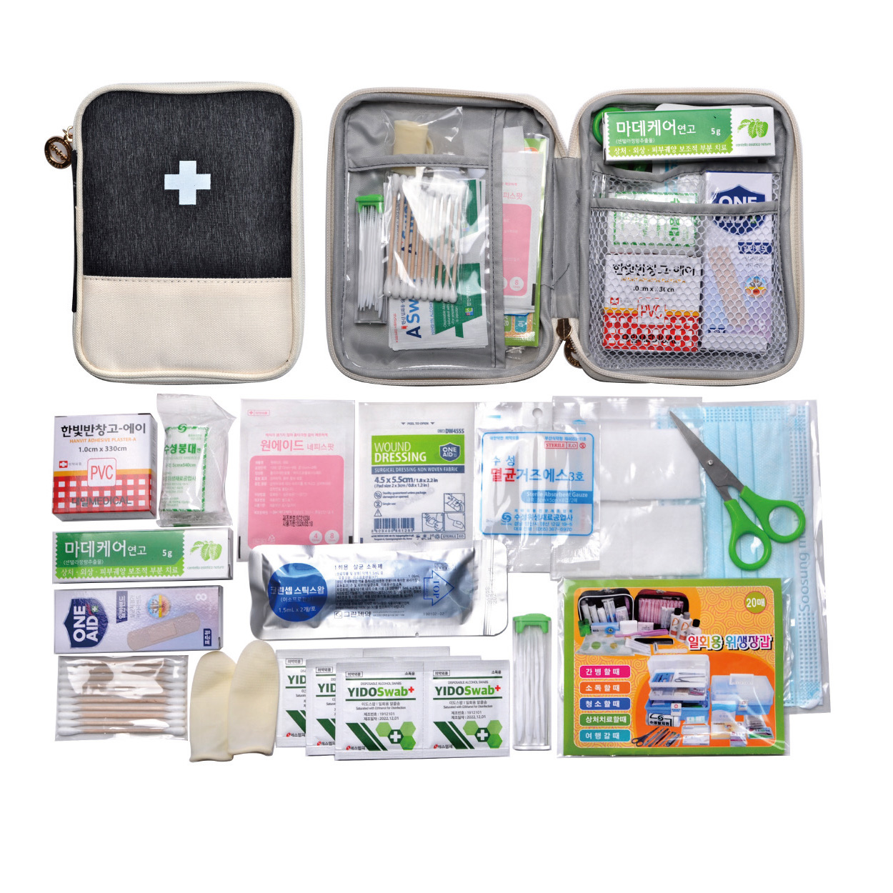 반창고/붕대소/마데케어연고/밴드8P/하이드로콜로이드밴드(스팟)/알콜스틱/ 지샤크2p/일회용마스크/가위/위생장갑/15p치간칫솔/알콜솜6p/드레싱밴드/ 멸균거즈2p/10p면봉/절솜4P/구급케이스 ※밴드이미지는 변경될수있음 / 종이케이스 포함