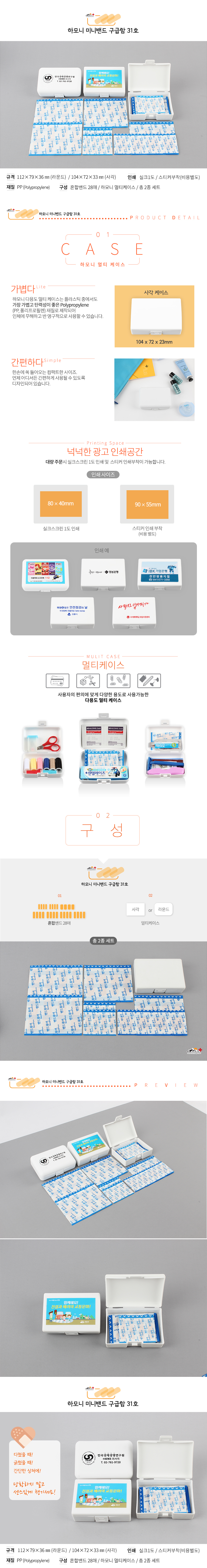 •SIZE : 104X72X33(mm) •종이케이스 200원 추가 •수량 : 400EA / 1박스 : 250개 •스티커 비용 별도 •혼합밴드 28매 ※모든 내용물들은 수급상황에 따라 예고없이 변경될 수 있습니다.