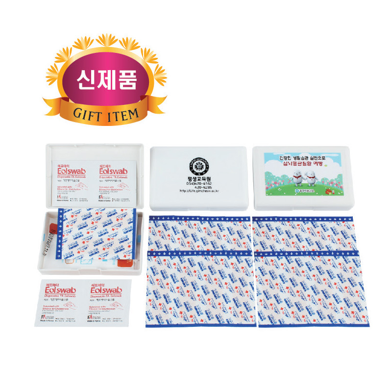•SIZE : 115X75X22(mm) •수량 : 400EA / 1박스 : 250개 •스티커 비용 별도 •표준밴드 16매, 알콜스왑 2매 ※모든 내용물들은 수급상황에 따라 예고없이 변경될 수 있습니다.